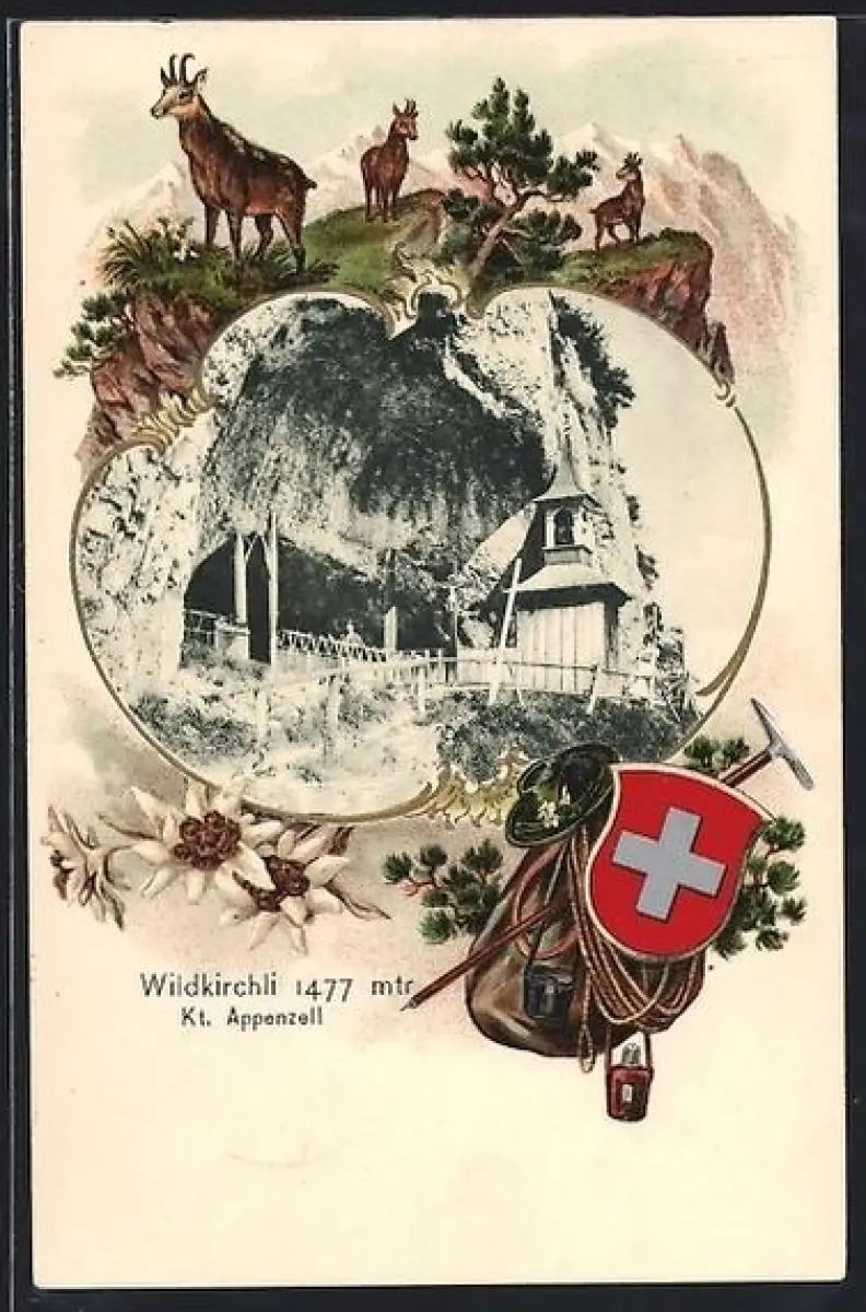 Passepartout-Lithographie Wildkirchli, Kapelle mit geprägten Wandersachen & Bergziegen