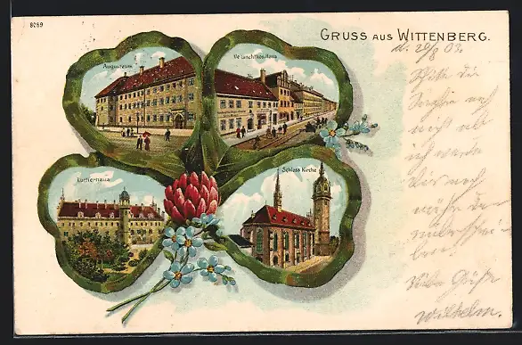 Passepartout-Lithographie Wittenberg, Melanchthon-Haus, Lutherhaus und Augusteum im Kleeblatt