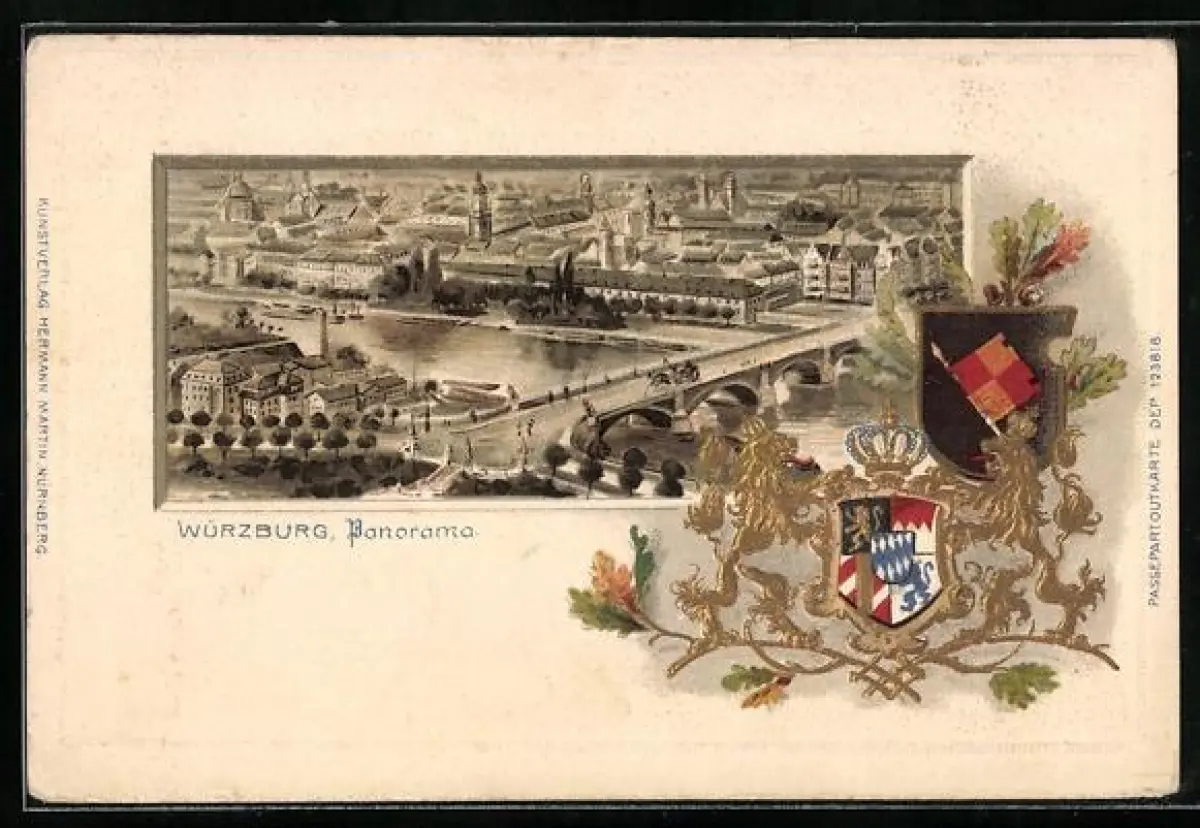 Passepartout-Lithographie Würzburg, Panorama mit Wappen und Brücke