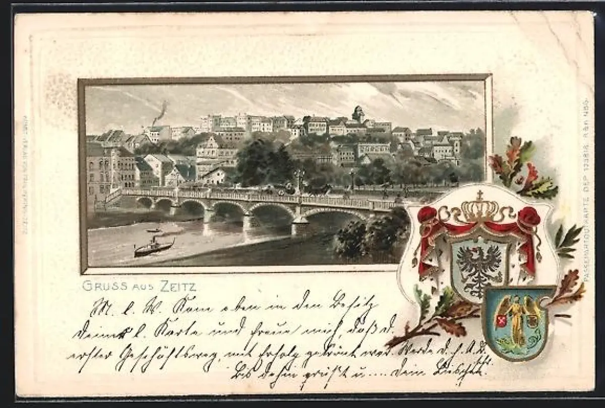 Passepartout-Lithographie Zeitz, Ortsansicht mit Brücke und Dampfer, Wappen