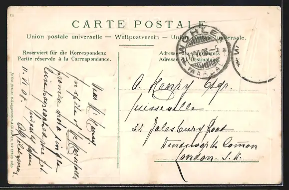gelaufen 1908, Briefmarke entfernt, Eckknick re. oben, guter Zustand