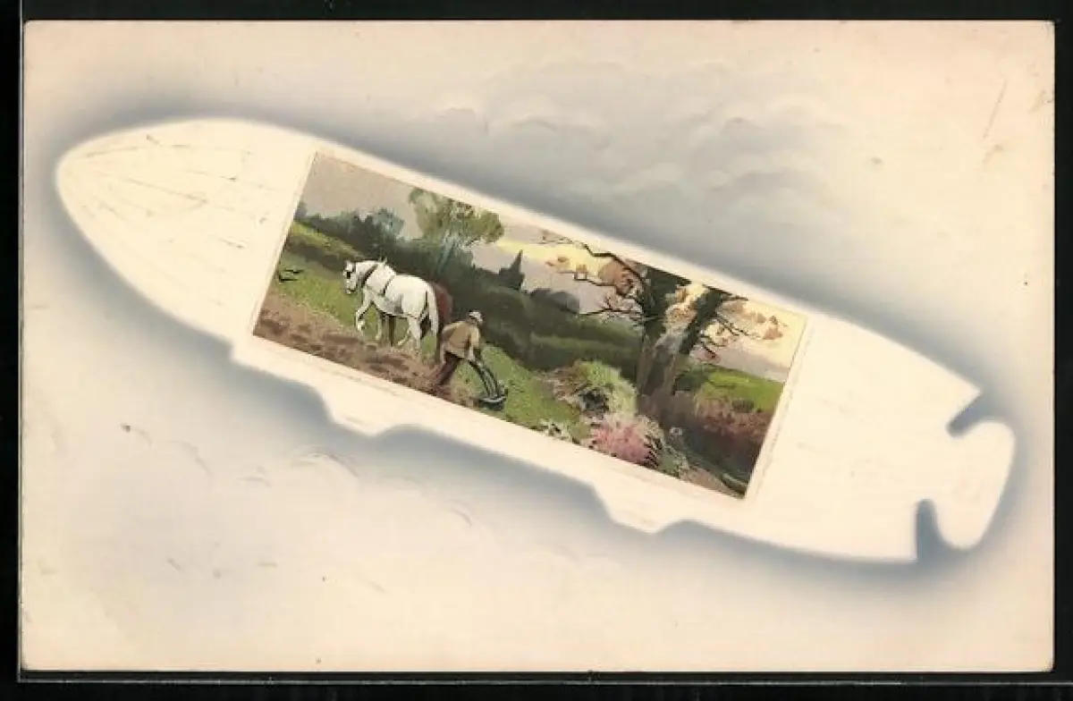 Passepartout-Präge-AK Bauer mit Pferdepflug im Zeppelin