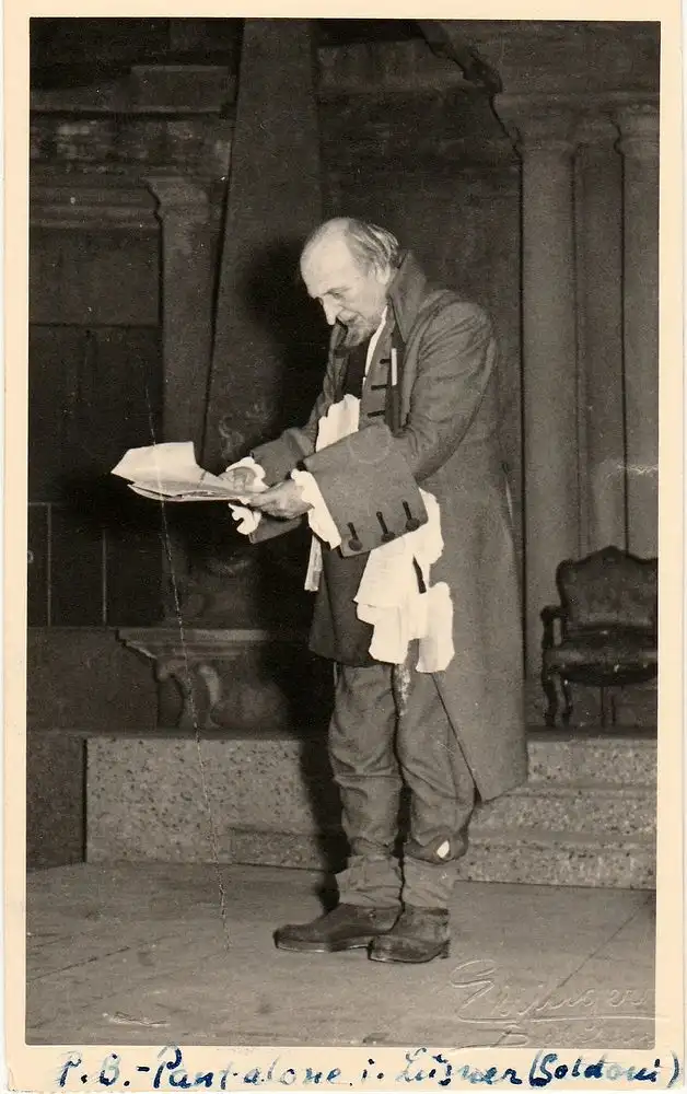 original Postkarte, Format ca. 13,8 x 8,5 cm, Vorderseite Paul Bildt in der Rolle des Pantalone in Goldonis Der Diener zweier Herren mit handschriftlichem Texthinweis dazu, Rückseite handschriftlicher Text in blauer Tinte. Zustand: sehr gut, gelaufen 22.8.1952 mit Sonderstempel Salzburger Festspiele Salzburg