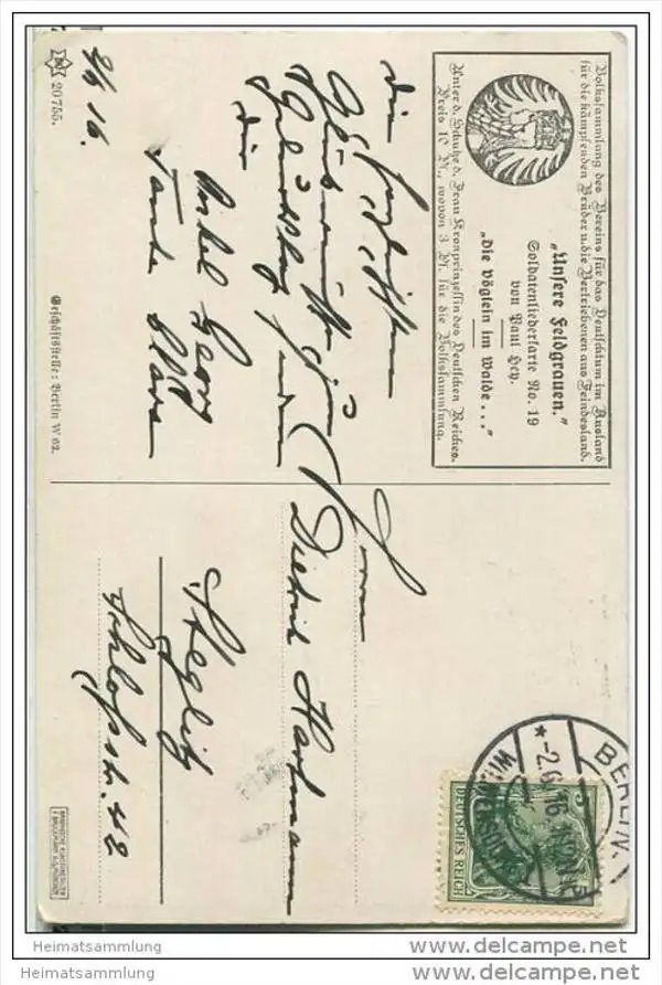 Paul Hey - Die Vöglein im Walde .... - Soldatenliederkarte Nr. 19 - Verein für das Deutschtum im Ausland (E37170) gel. 1916