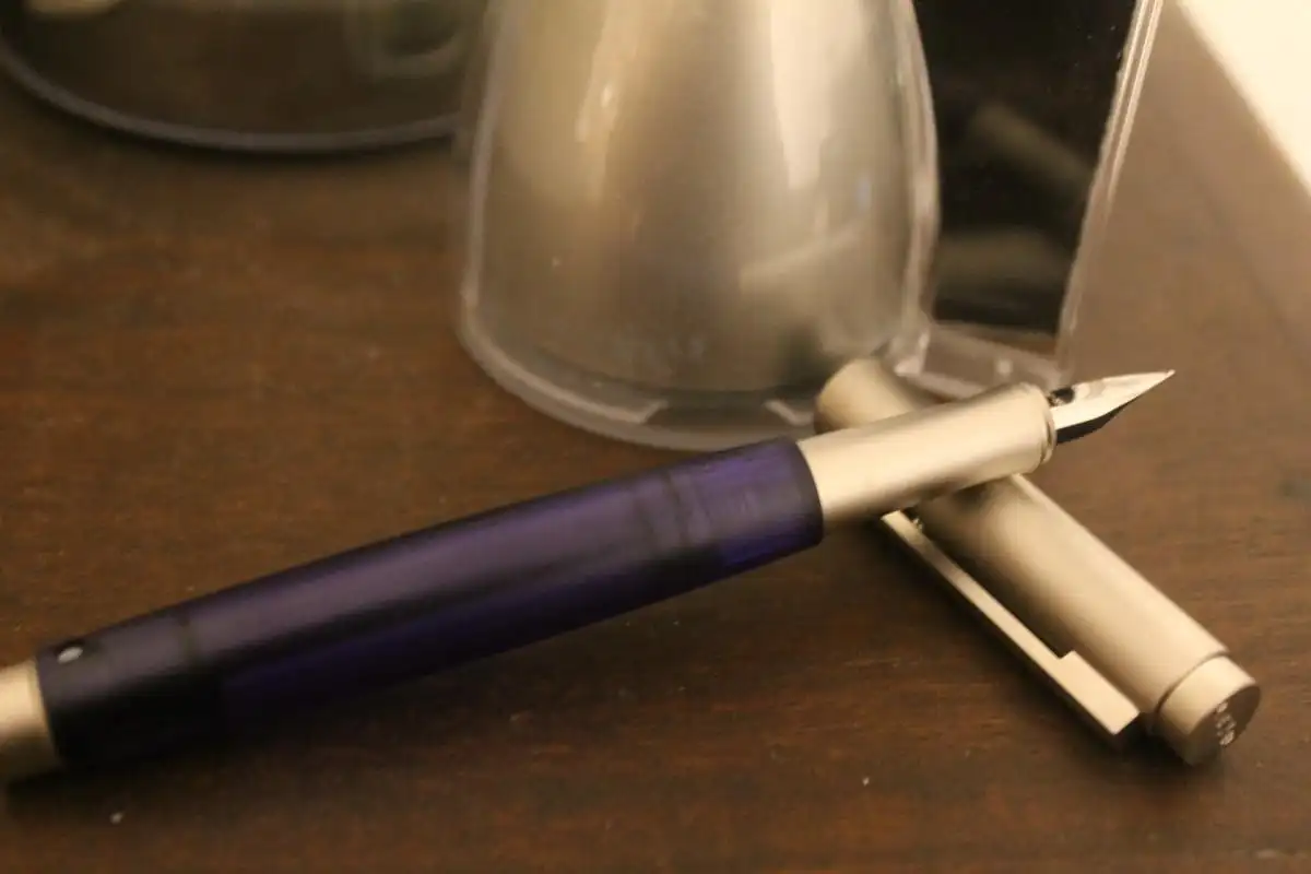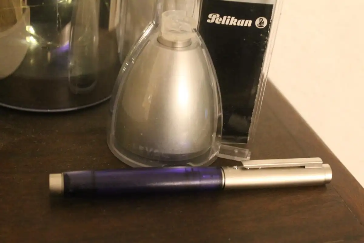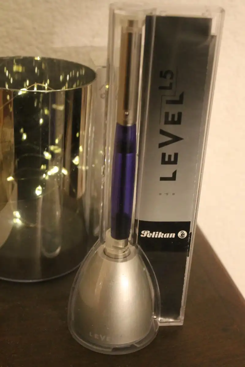 Pelikan LEVEL L 5 - Silver, ein innovatives Schreibgerät, welches Ende der 90zige Jahre auf den Markt kam. Das Gerät hat eine 585er/14 Carat Echtgoldfeder in Weißgold in der Federstärke Fein. Zum Artikel gehört ein Penstand mit integriertem Tintenfaß (gefüllt). Der Vorratstank des Füllhalters fasst dreimal soviel Tinte wie ein herkömmlicher Kolbenfüller und sogar fünfmal soviel wie eine Tintenpatrone. Der gesamte blau translucente Schaft des Schreiberätes dient als Tintenreservoir. Die Kappe, das Griffstück und der Füllknopf sind versilbert und als Anlaufschutz zusätzlich rhodiniert.