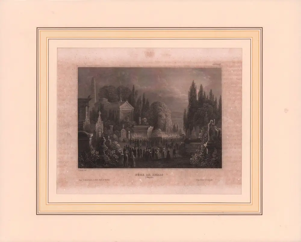 Le Cimetière du Père-Lachaise ist der größte Friedhof von Paris u. die erste als Parkfriedhof angelegte Begräbnisstelle der Welt. Er ist nach dem Jesuiten-Pater François d’Aix de Lachaise [1624-1709], dem Beichtvater Louis XIV., benannt u. auf dessen Gärten errichtet. - Gebräunt u. stockfleckig