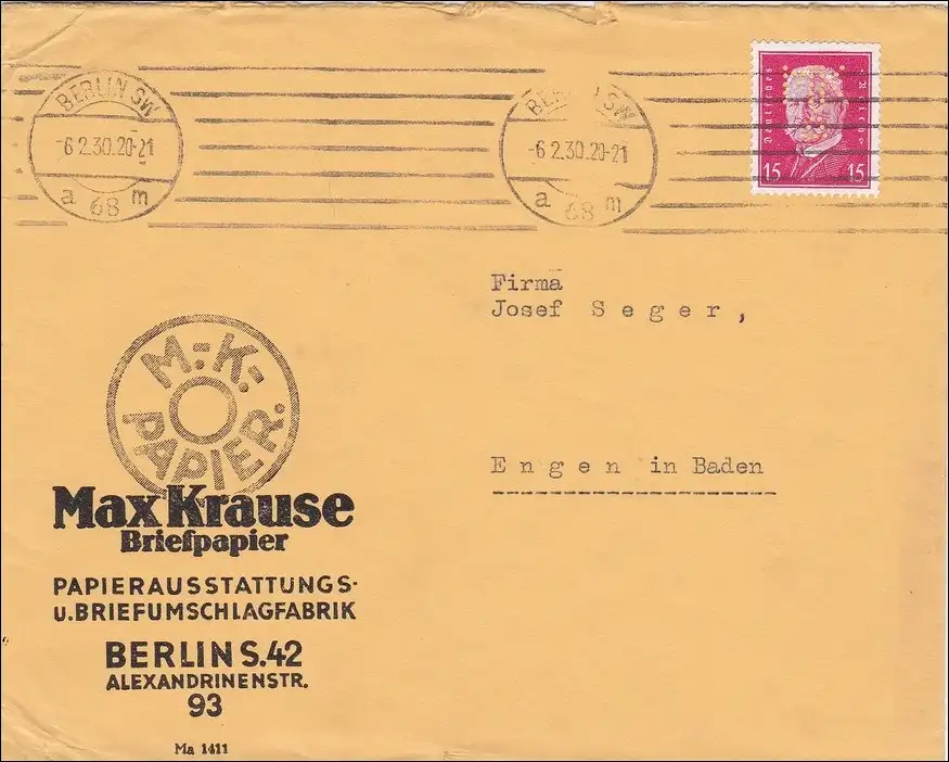 Perfin: Brief aus Berlin 1930, Max Krause Briefpapier, MK