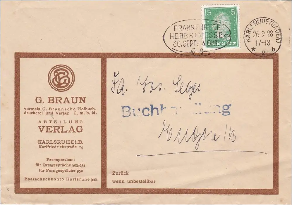 Perfin: Brief aus Karlsruhe 1928, G. Braun Verlag,