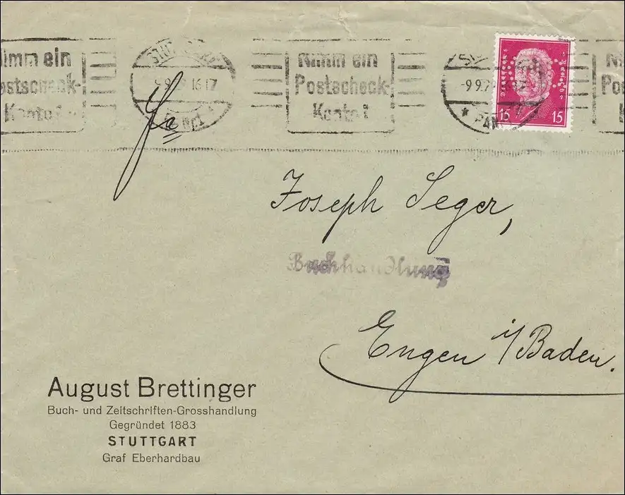 Perfin: Brief aus Stuttgart, August Brettinger, 1928, KNO