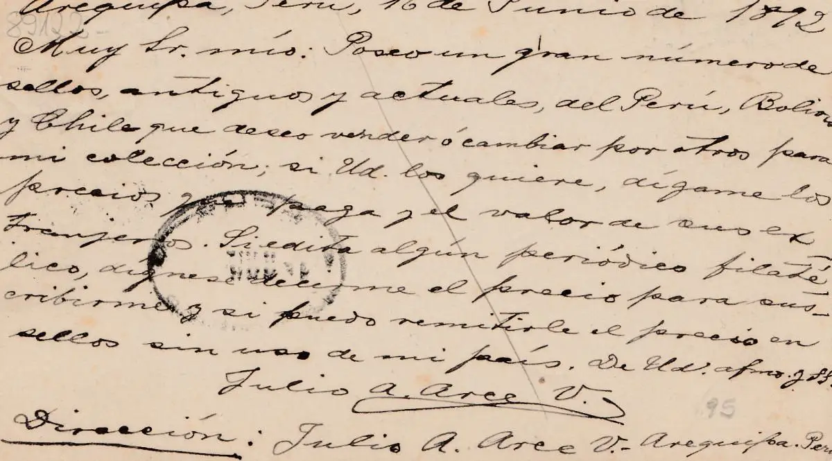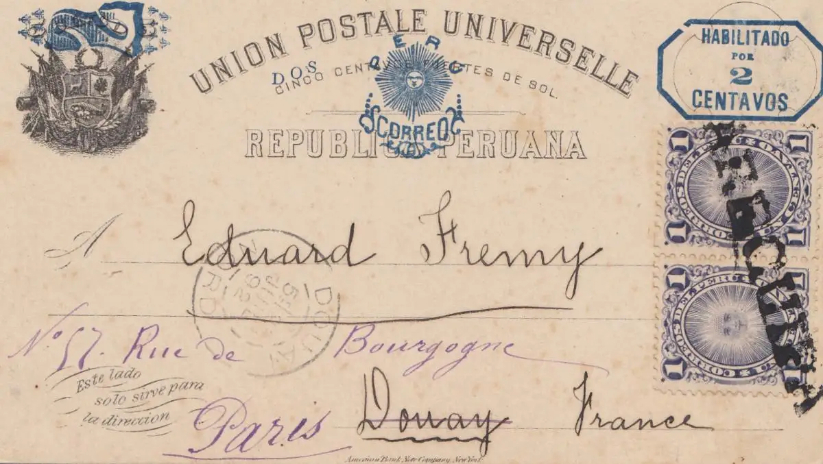 Peru 1892: post card Arequipa to Donay, forwarded to Paris