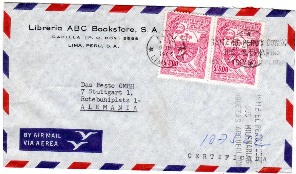 Peru 1965, MeF 2x3 S. Tabak auf Luftpost Brief v. Lima n. Deutschland
