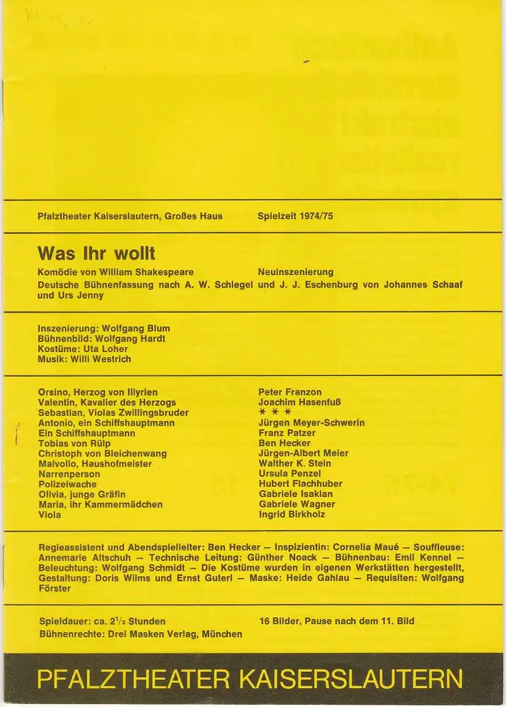 Pfalztheater Kaiserslautern, Wolfgang Blum, Peter Back-Vega: Programmheft WAS IHR WOLLT Komödie von William Shakespeare Spielzeit 1974 / 75 Heft 13.