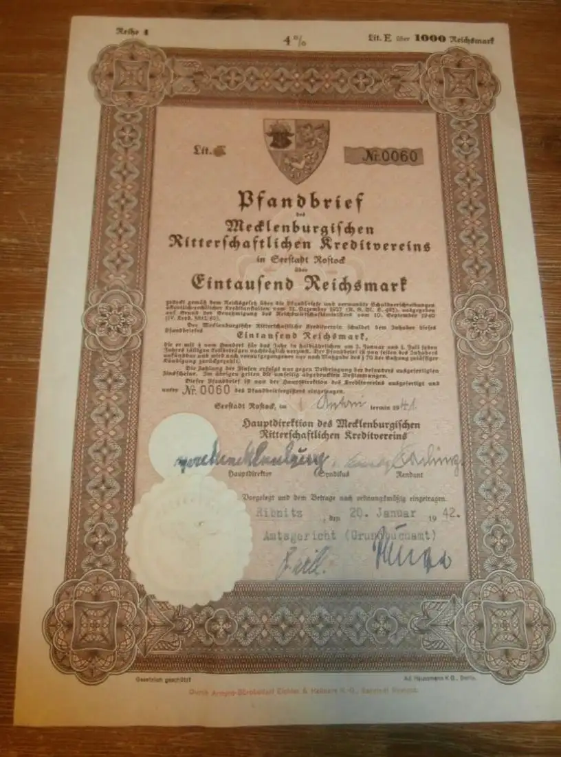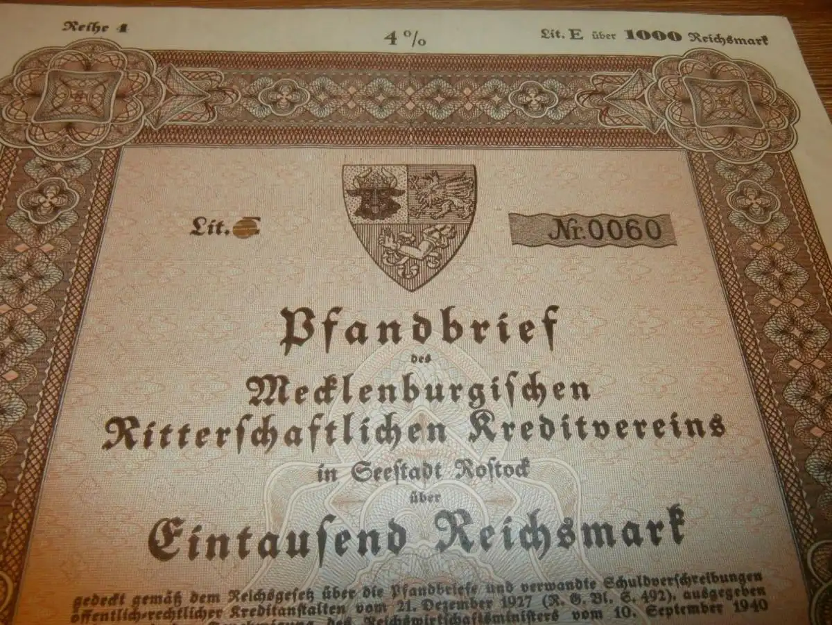 Pfandbrief 1000 Reichsmark Ribnitz / Rostock 1942 , Mecklenburg !!