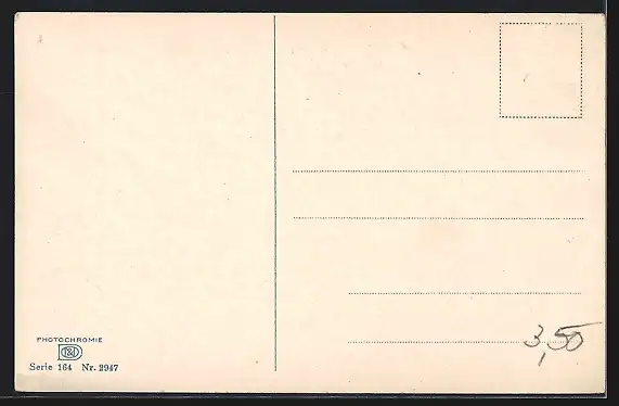 Personenbezogene Daten auf der Rückseite der Karte wurden durch blauen Textmarker unkenntlich gemacht. Die blauen Stellen sind auf die Vorderseite durchgeweicht und wirken sich negativ auf das Postkartenfoto aus