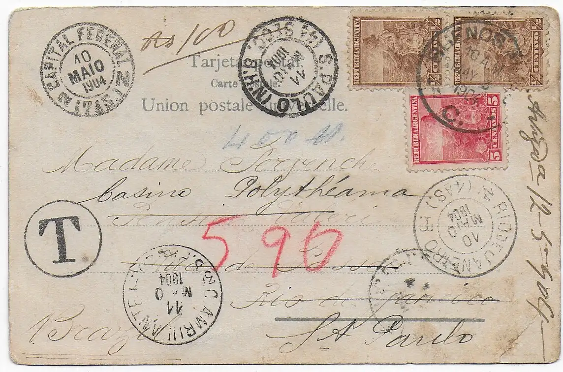 Picture post card Gran Chaco, 1904 via Rio to S. Paulo