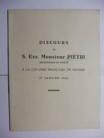 Titel: DISCOURS DE S. Exc. MONSIEUR PIETRI * AMBASSADEUR DE FRANCE A LA COLONIE FRANCAISE DE MADRID 1er JANVIER 1944