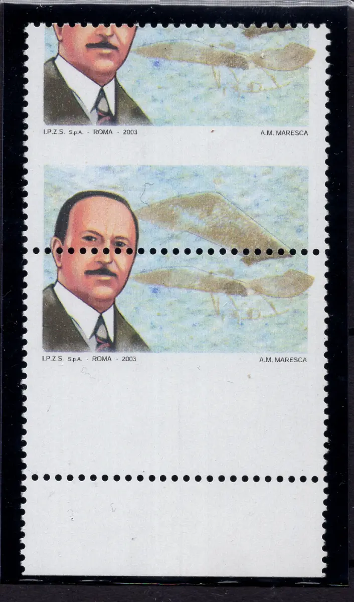 MNH - Vollgummi - LuftfahrtpioniereEuro 0,52 Marken Nr. 2704 vertikales Paar b. von f. unten, ohne Druck der schwarzen Beschriftungen mit stark vertikal verschobener Verzahnung - neuer perfekter Vollgummi - auffällig und hochwertig aus der letzten Reihe des Blattes Cod. 3088/WEB