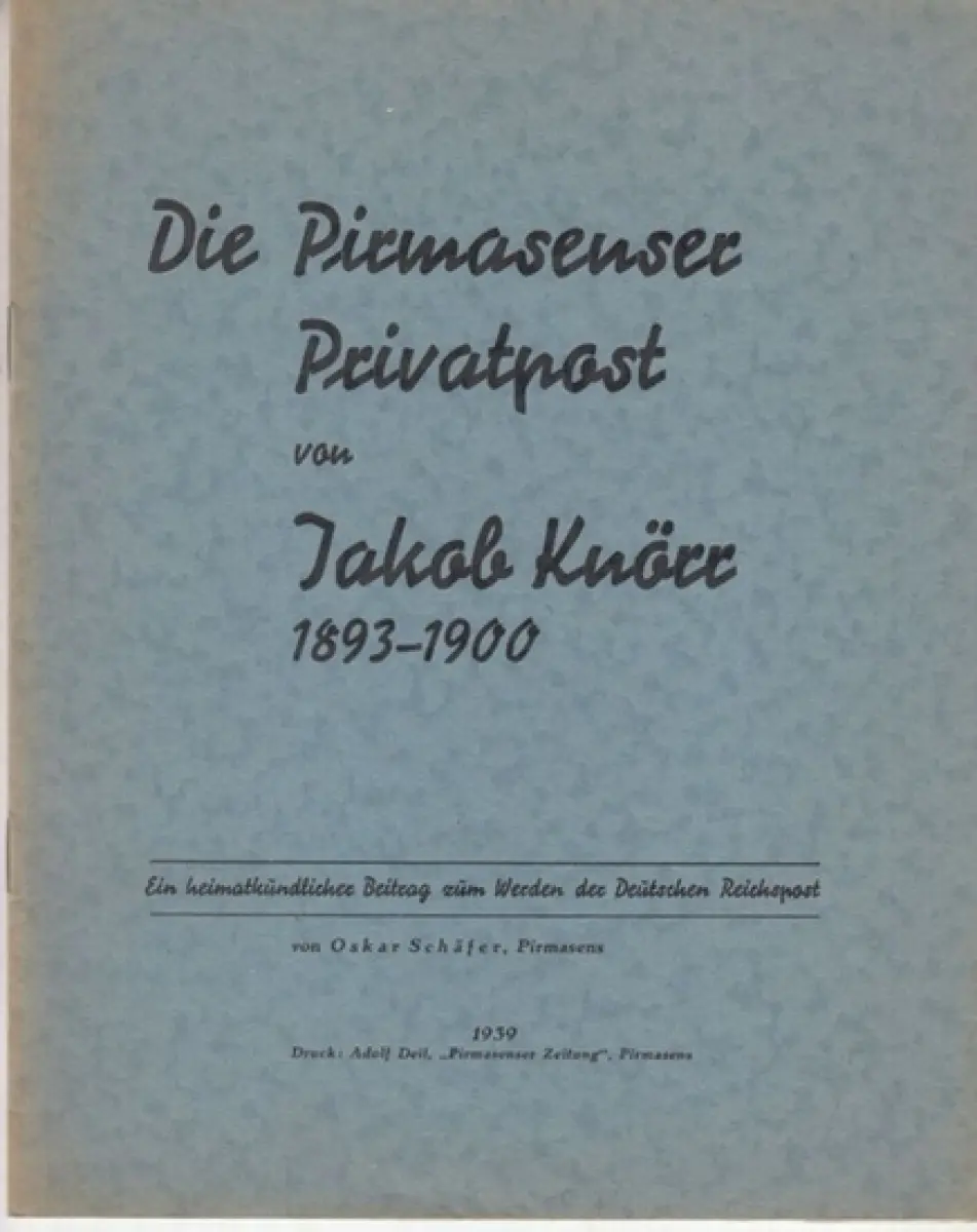 Pirmasens. - Knörr, Jakob. - Schäfer, Oskar: Die Pirmasenser Privatpost von Jakob Knörr, 1893-1900. Ein heimatkundlicher Beitrag zum Werden der Deutschen Reichspost.
