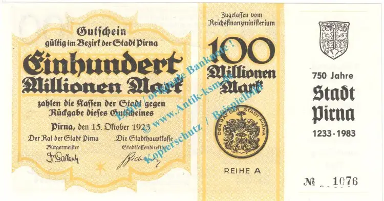 Gutschein / Gedenkschein / Nachdruck über Einhundert Millionen Mark , 750 Jahre Stadt PirnaBundesland : Sachsen  ,  Keller : - - -