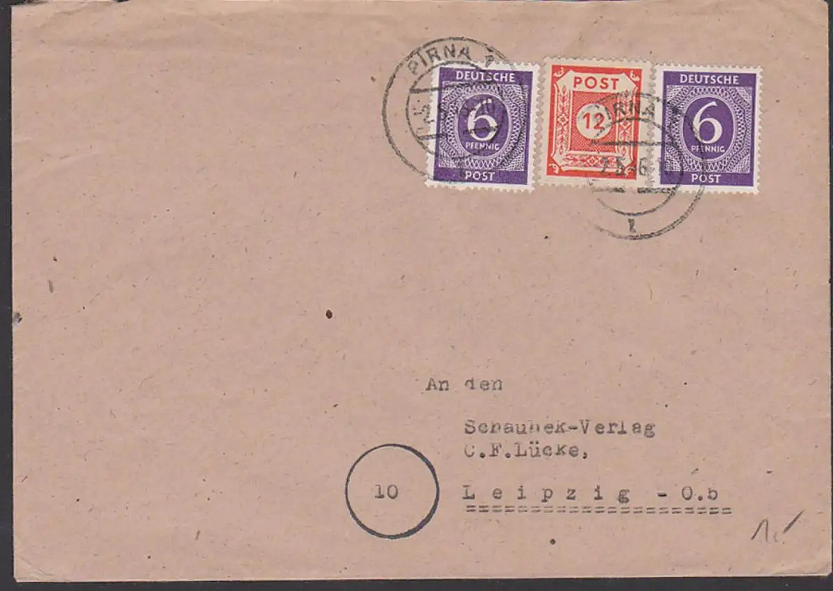 Pirna 2.5.46, portogenau SBZ 12 Pf. OPD Ostsachsen 58 in MiF mit 6 Pfg. Ziffern,