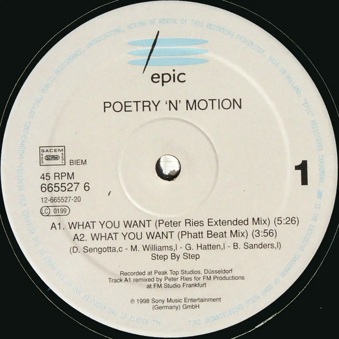 12" Maxi Poetry 'n' Motion - What You Want, Einheitscover der Plattenfirma, Zustand Platte VG+ Hülle VG+; Made in France 1998 Epic 665527 6, Tracks Peter Ries Ext. Mix 5:26, Phatt Beat Mix 3:56, Original 5:01, Collective Chaos Mix 4:17, Stonebridge Radio 3:36