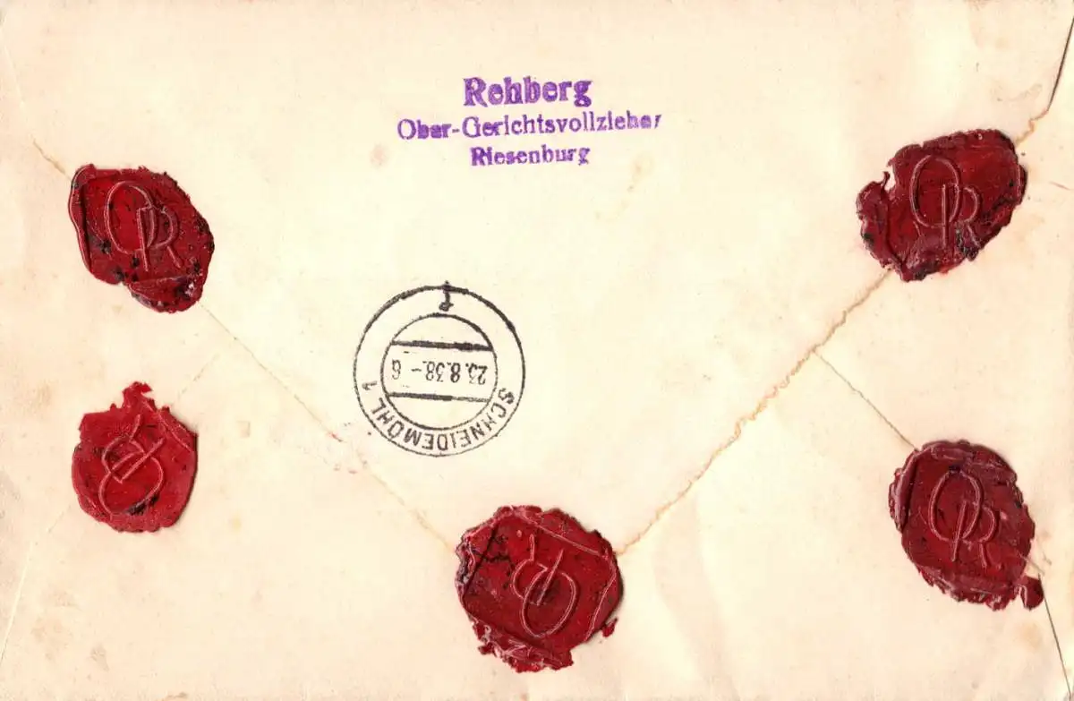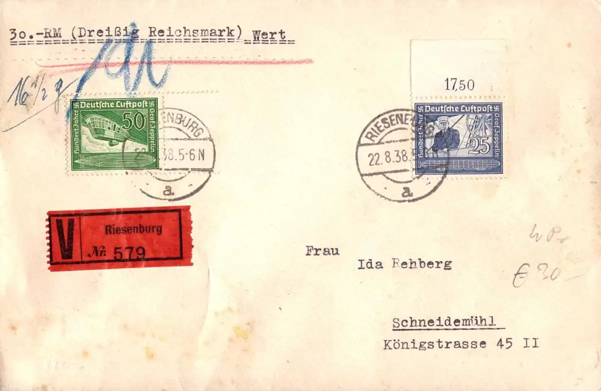 O-0014, Riesenburg Kreis Schubin in Westpreussen, dekorativer Wertbrief nach Schneidemühl von 1938