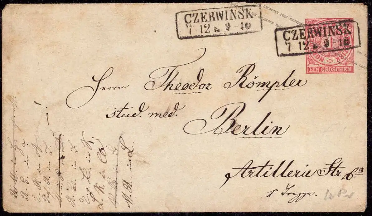 Freie Bezeichnung: O-0015 Westpreussen, ca. 1870, Ganzsache, NDP, Norddeutscher Postbezirk aus Czerwinsk Kreis Marienwerder nach Berlin