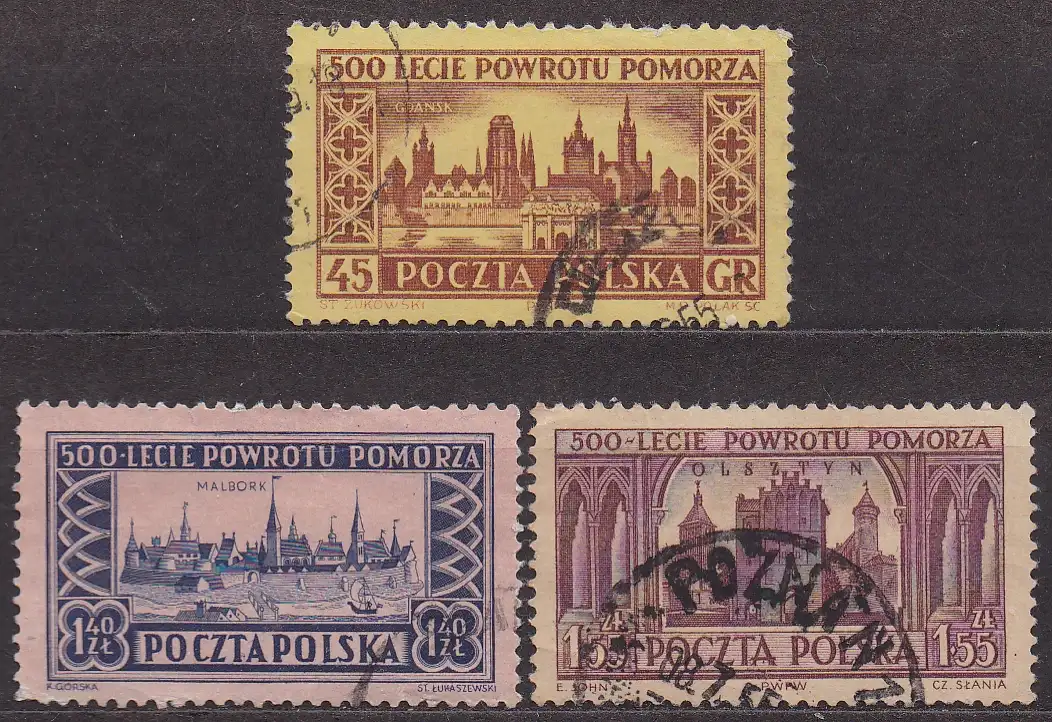 Polen, Mi-Nr. 873, 875 + 876 gest., Stadtansichten von Danzig, Marienburg + Allenstein