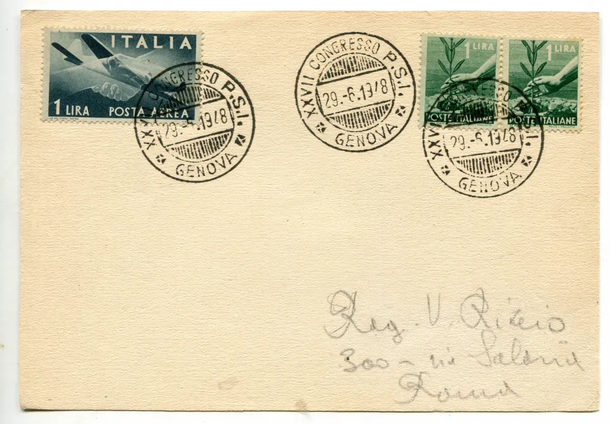 Politik Italienische Sozialistische Partei Annullierung des Kongresses Postkarte - Frankierter Karton mit Werten der Serie Democratica, die mit dem Sonderguller des XXVII. Kongresses P.S.I. annulliert wurden Genua 29.6.1948 - Wertstempel - Nr. 1028 / OUTLET