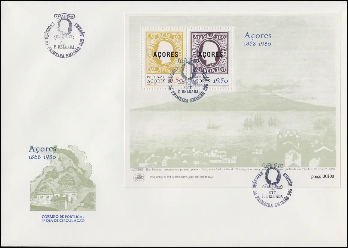 Portugal Azoren Erstausgabe mit Aufdruck Azoren 1868-1980, Block - FDC