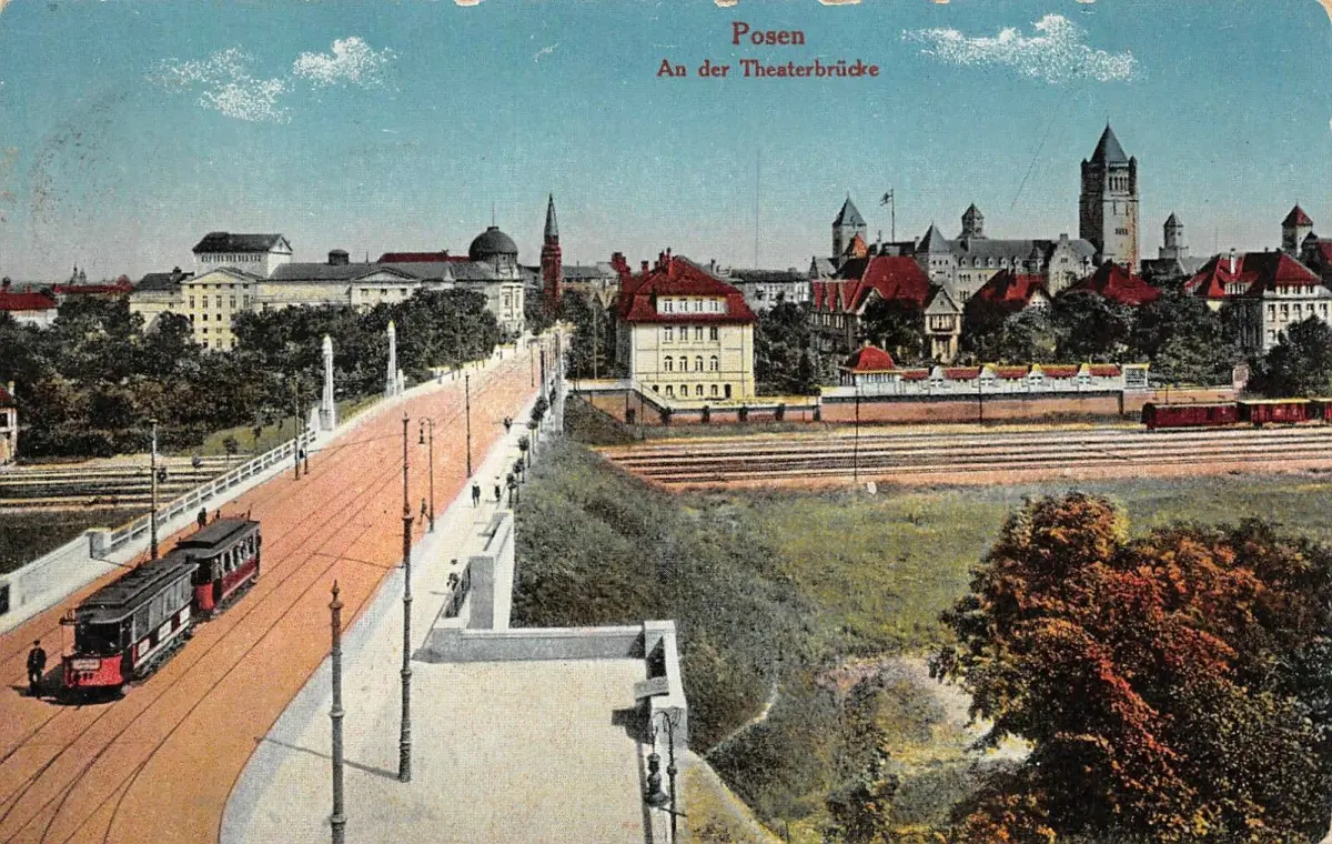 Posen An der Theaterbrücke Straßenbahn Feldpostkarte AK