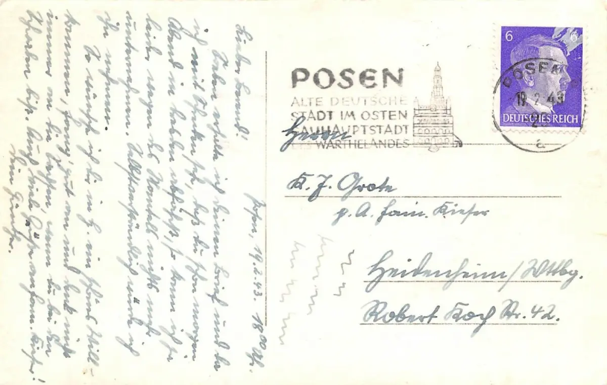 Rückseite: gelaufen 1943 von Posen