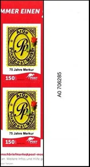 • MichSeite PostModern: 29.03.2022, "75 Jahre Merkur", Satz, Bogennummer, postfrisch Beschreibung \nAusgabeland: Bundesrepublik Deutschland \nPostdienstleister: PostModern (Media Logistik), Dresden \nAusgabeanlass: Personalisierte Briefmarkenausgabe "75 Jahre Merkur" Katalognummer: - Ausgabedatum: 00.03.2022 Nominale: Satz (1 Wert) zu 1,50 EUR (2 x) \nTyp: - \nErhaltung: selbstklebend, zähnungsartig gestanzt, postfrisch \nHinweis: mit Bogennummer "A ..." über 2 Briefmarken, Abbildung zeigt Vorder- und Rückseite,