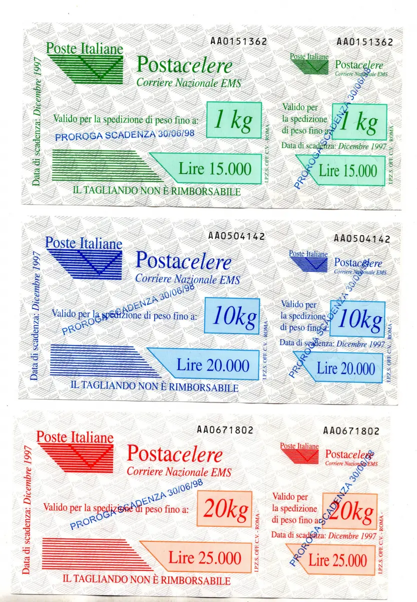 H - Ohne Gummi - Beschleuniger Nr. 4/6 Serie von drei Gutscheinen mit Stempel Verlängerung Ablauf 30/6/98 gültig für den Versand von Paketen mit einem Gewicht von 1, 10 und 20 kg. - neue perfekte Cod. 418/17
