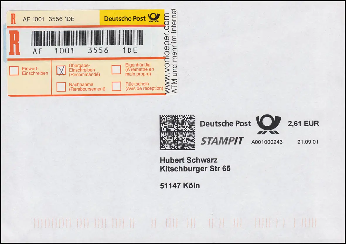 Postautomation: STAMPIT (PC-Frankatur) mit Sonder-R-Zettel, gelaufen 21.9.2001