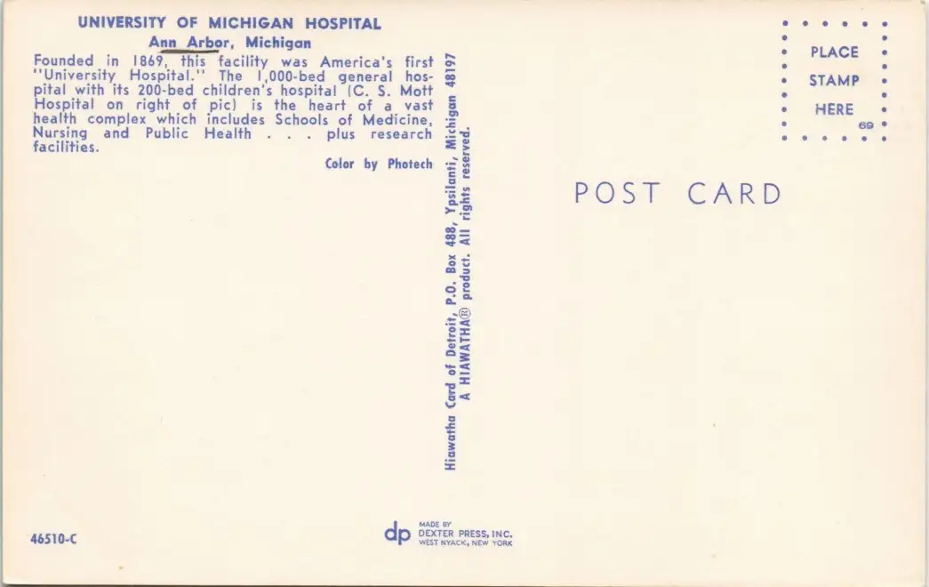 Postcard Ann Arbor UNIVERSITY OF MICHIGAN HOSPITAL Aerial View, USA 1965
