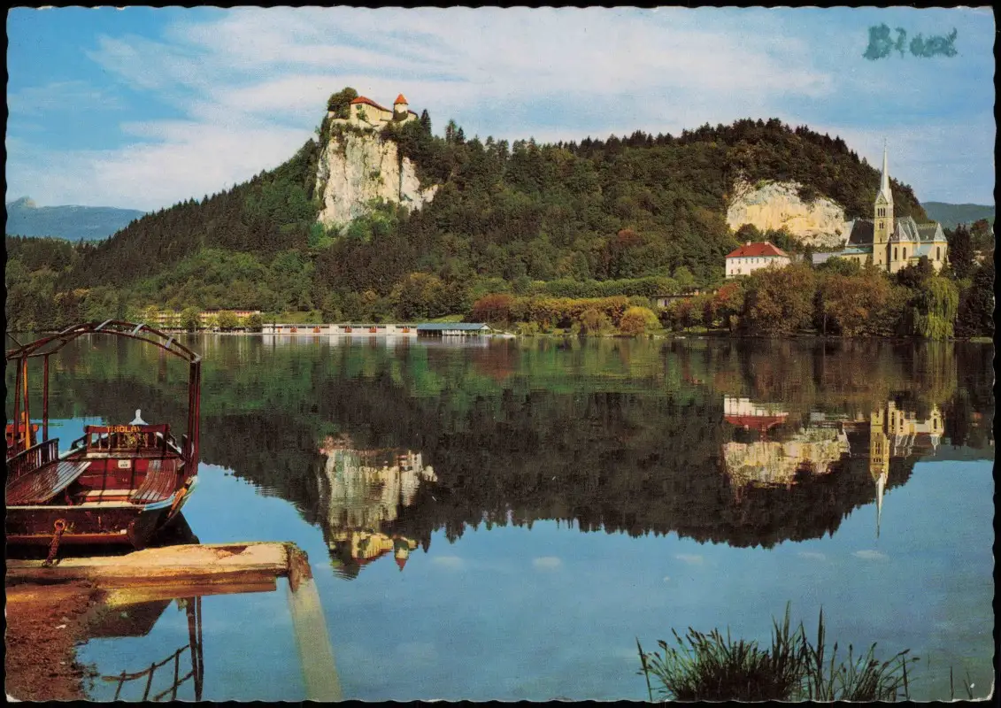 Postcard Bled Veldes Partie am See mit Bootsanleger 1968