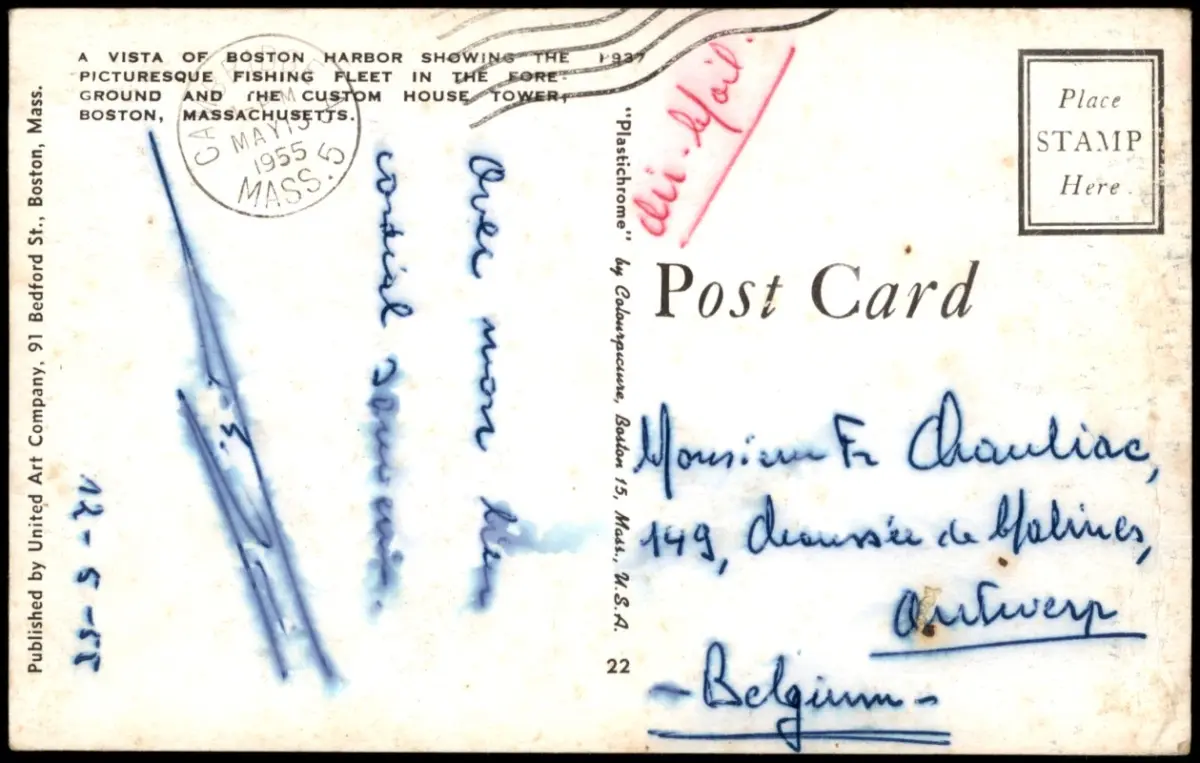 Postcard Boston Harbor View Fishing Fleet Custom House Tower 1955