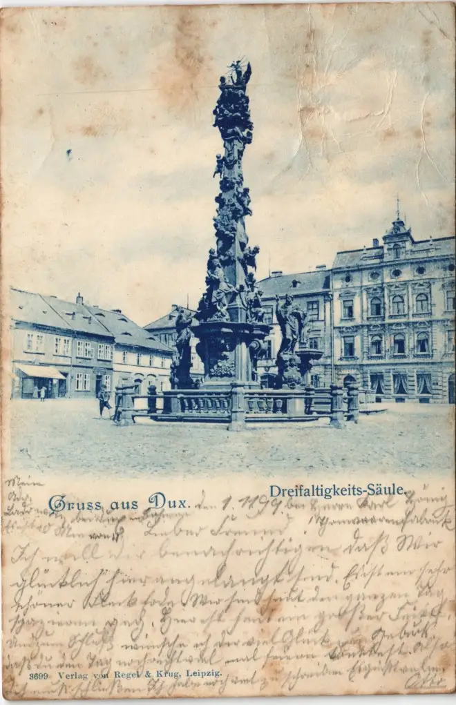 Postcard Dux Duchcov Dreifaltigkeits-Säule, Markt - Blaudruck 1899