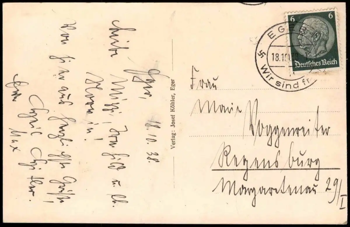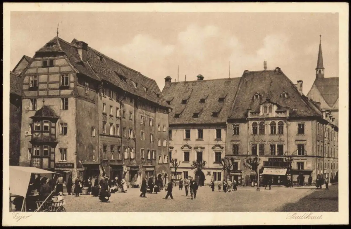 Postcard Eger Cheb Markttreiben am Stadthaus 1938