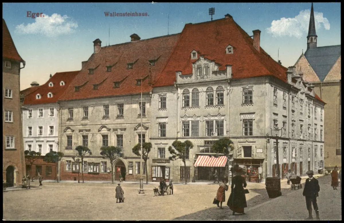 Postcard Eger Cheb Wallensteinhaus Straßenpartie 1914