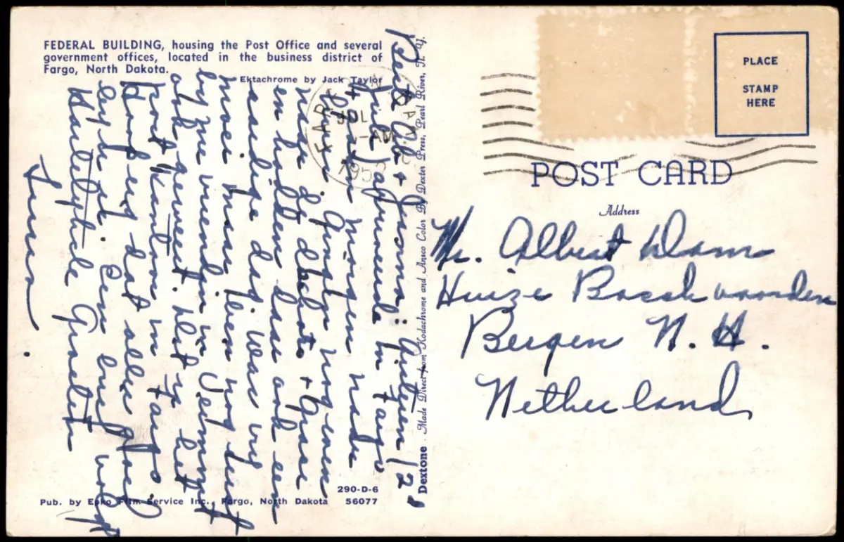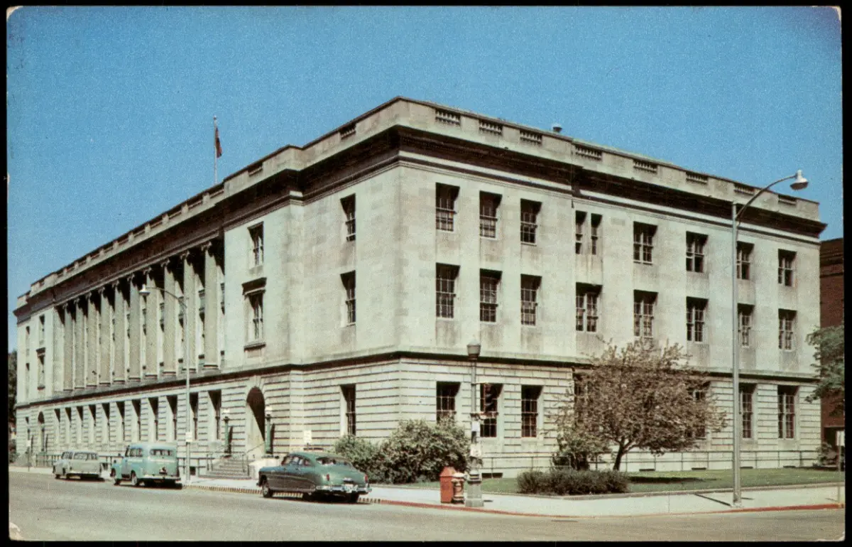Infos: Farbfotografie des Federal Building in Fargo, North Dakota. Das Gebäude beherbergt das Postamt sowie verschiedene Regierungsbüros und befindet sich im Geschäftsviertel der Stadt. Die Aufnahme wurde als Ektachrome von Jack Taylor erstellt. Gedruckt wurde die Karte im Dextone-Verfahren von Dexter Press, Pearl River, N.Y.