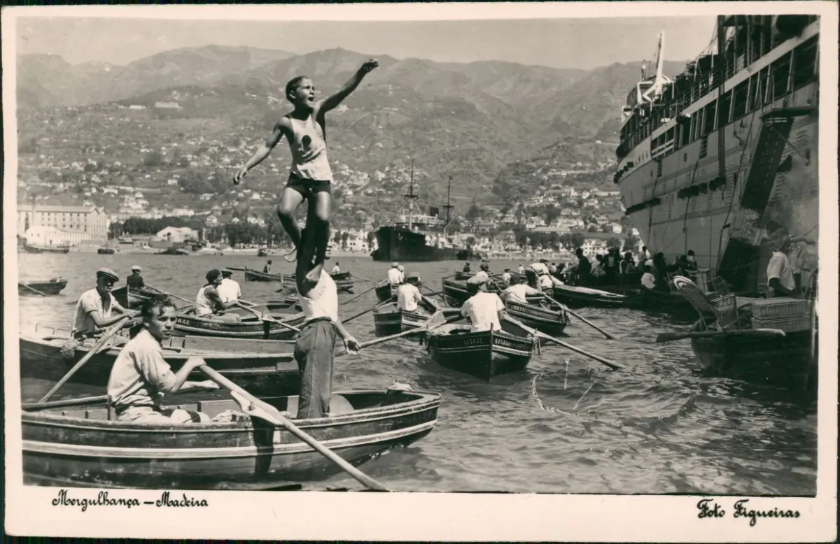 Postcard Funchal Ruderboote an den Luxuslinern Hafen Madeira 1940