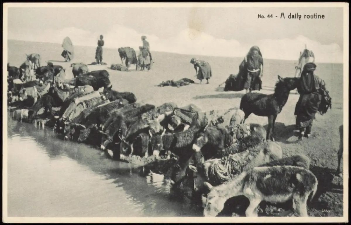 Postcard Irak Allgemein A daily routine Iraq Tiere Oase 1922