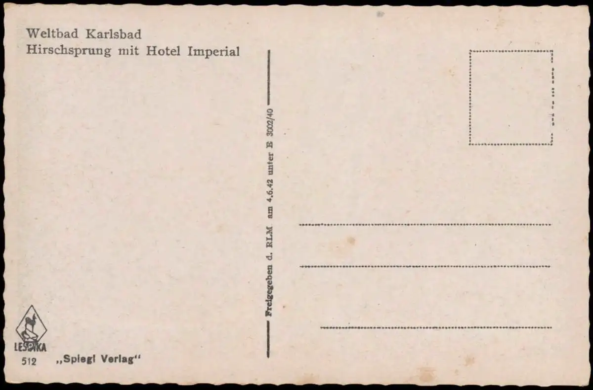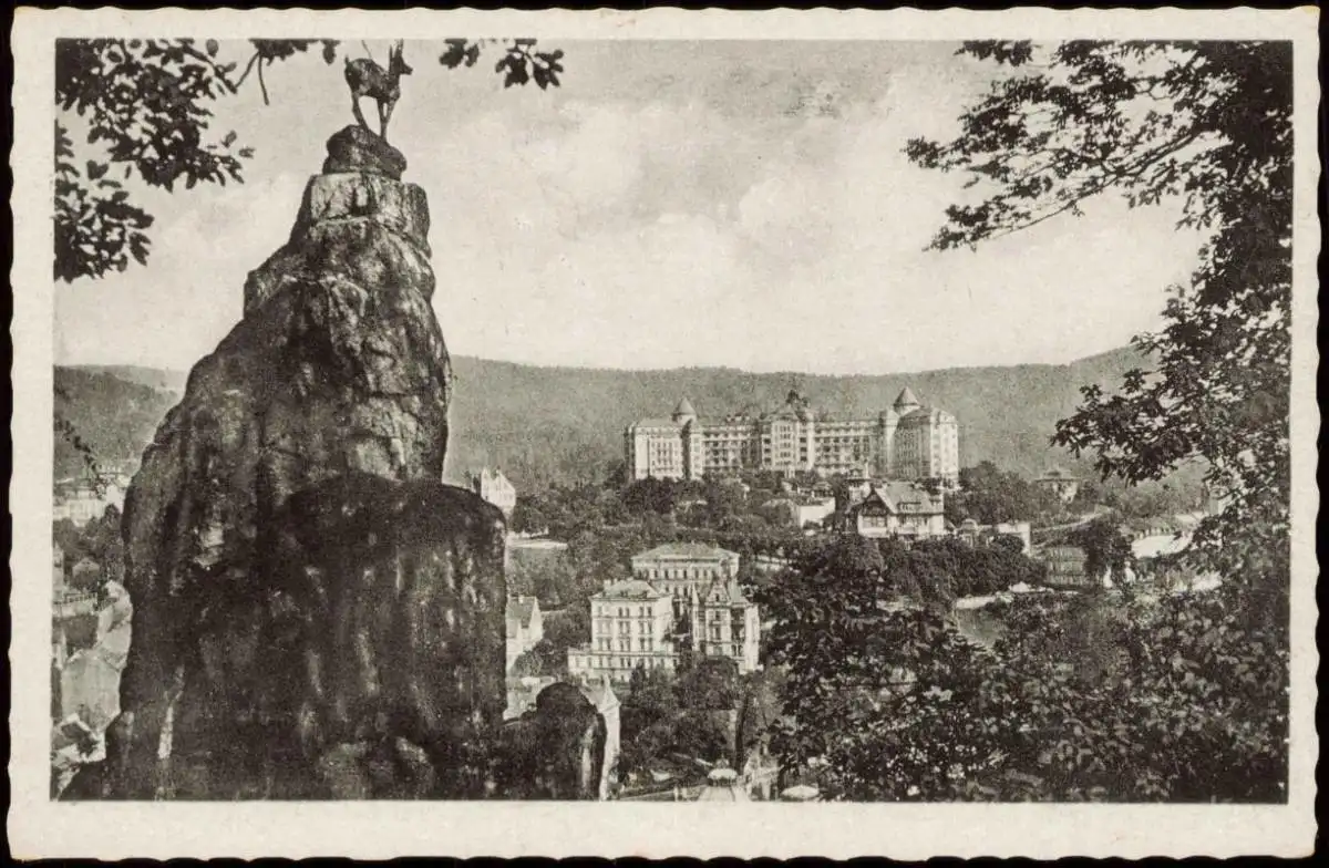 Postcard Karlsbad Karlovy Vary Hirschsprung mit Hotel Imperial 1942