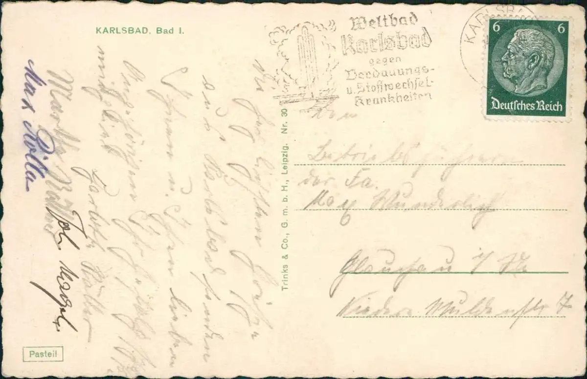 Postcard Karlsbad Karlovy Vary Straßenpartie 1938