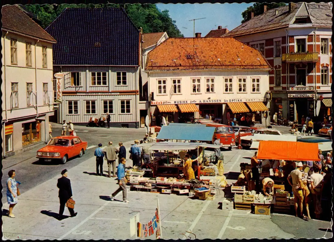 Postcard Kragerø Torget, Marktplatz, Autos VW Bulli, Marktstände 1976