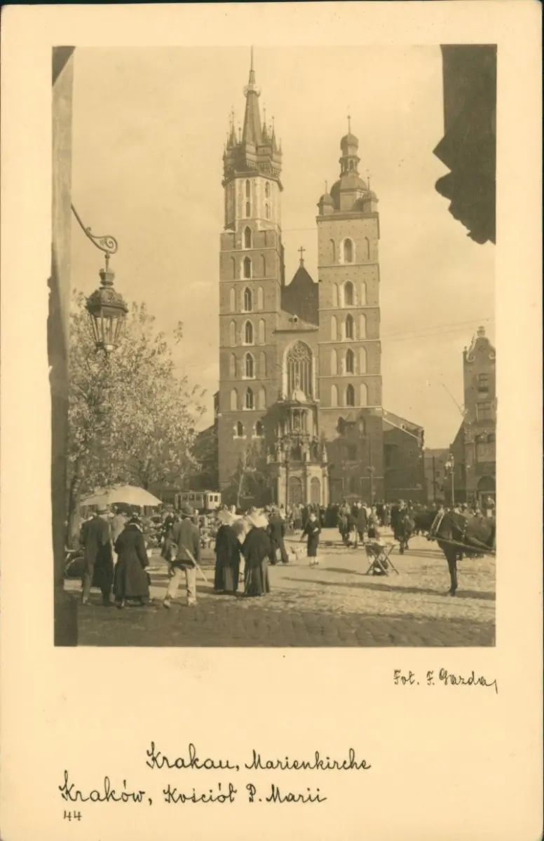 Postcard Krakau Kraków Marienkirche belebt Straßenbahn 1941
