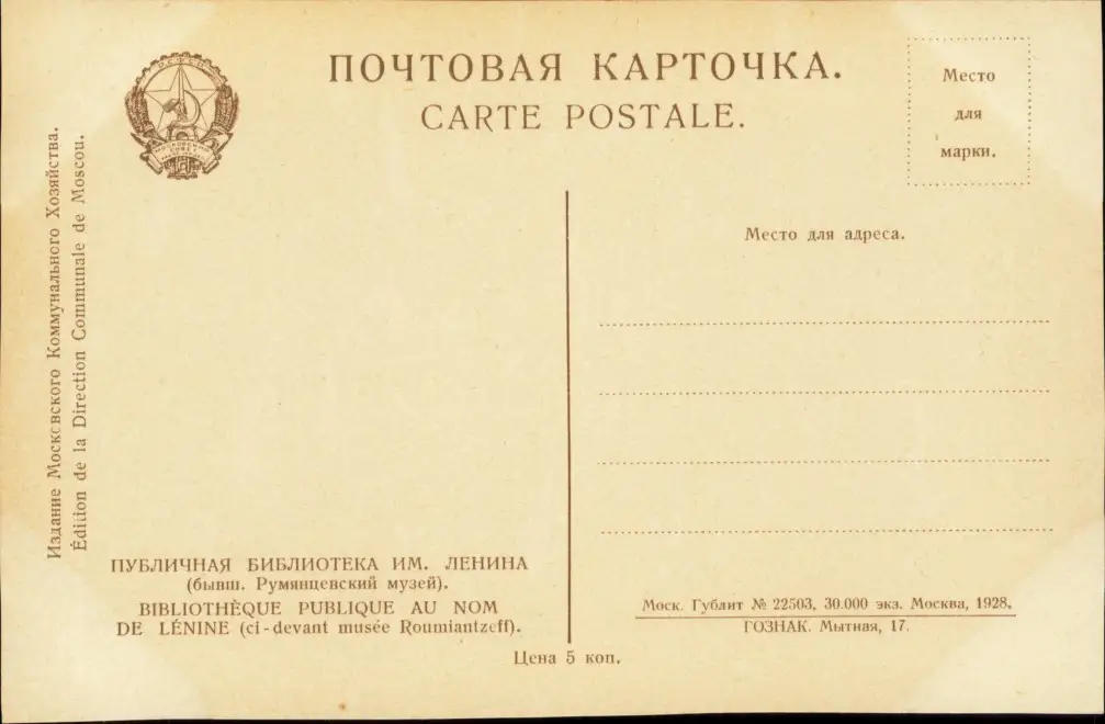 Postcard Moskau Москва́ BIBLIOTHÈQUE PUBLIQUE AU NOM 1928