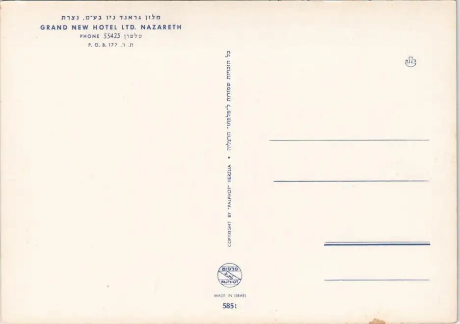 Postcard Nazareth GRAND NEW HOTEL, NAZARETH 1965